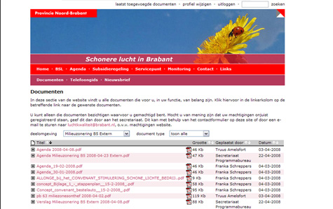 De provincie Noord-Brabant heeft in mijn werkzame periode bij Ecommany een website laten ontwikkelen voor het project 'Schonere lucht in Brabant', waarmee eenvoudig de bij het project betrokken personen de voor hun functie relevante documenten konen inzien.